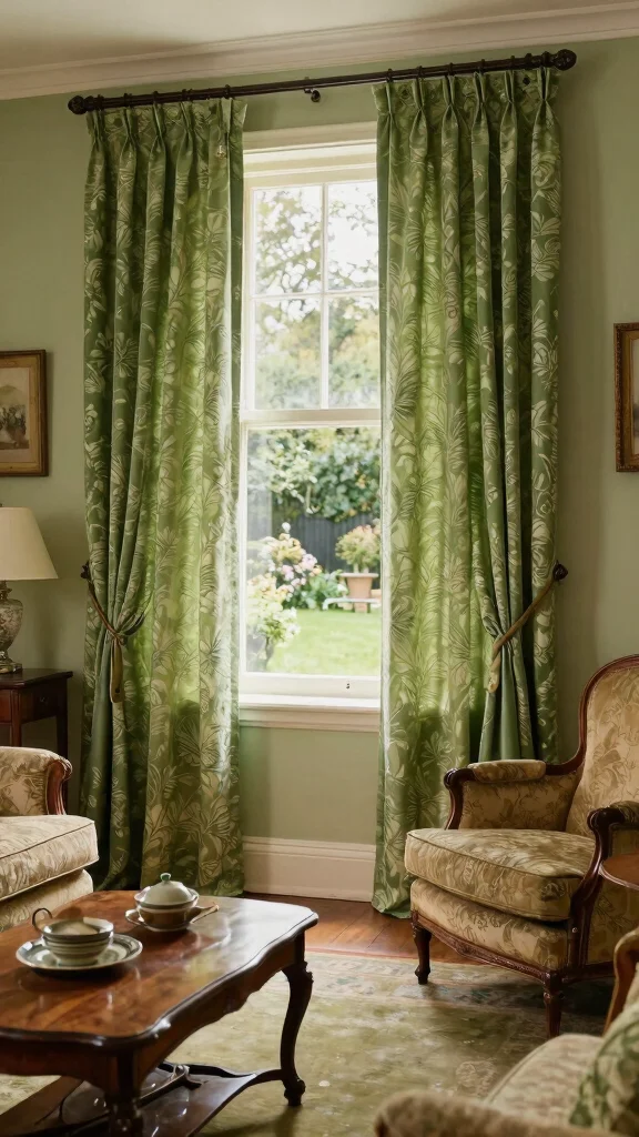 Embrace vintage charm with green curtains that feature classic patterns or textures. This look can evoke a sense of nostalgia and warmth, creating a cozy atmosphere in your living room. Imagine curtains with paisley or damask patterns enhancing antique wooden furniture for a timeless appeal.