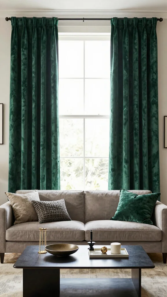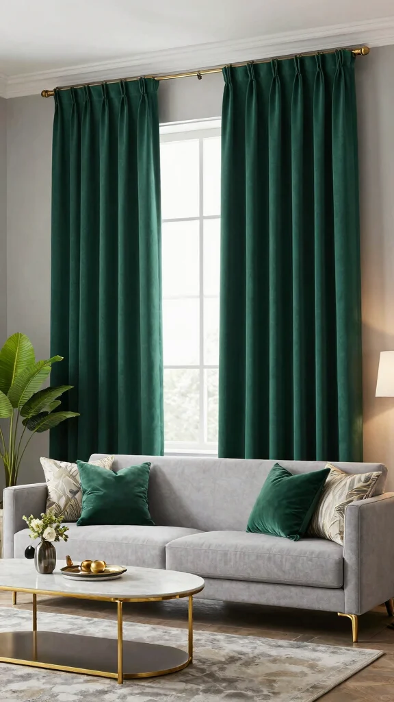 Emerald green curtains are the perfect choice if you want to make a striking statement in your living room. This rich and vibrant hue infuses elegance and drama into your decor, especially when complemented by metallic accents or natural textures. Picture emerald curtains framing a chic window, paired with gold decor for a luxurious touch.
