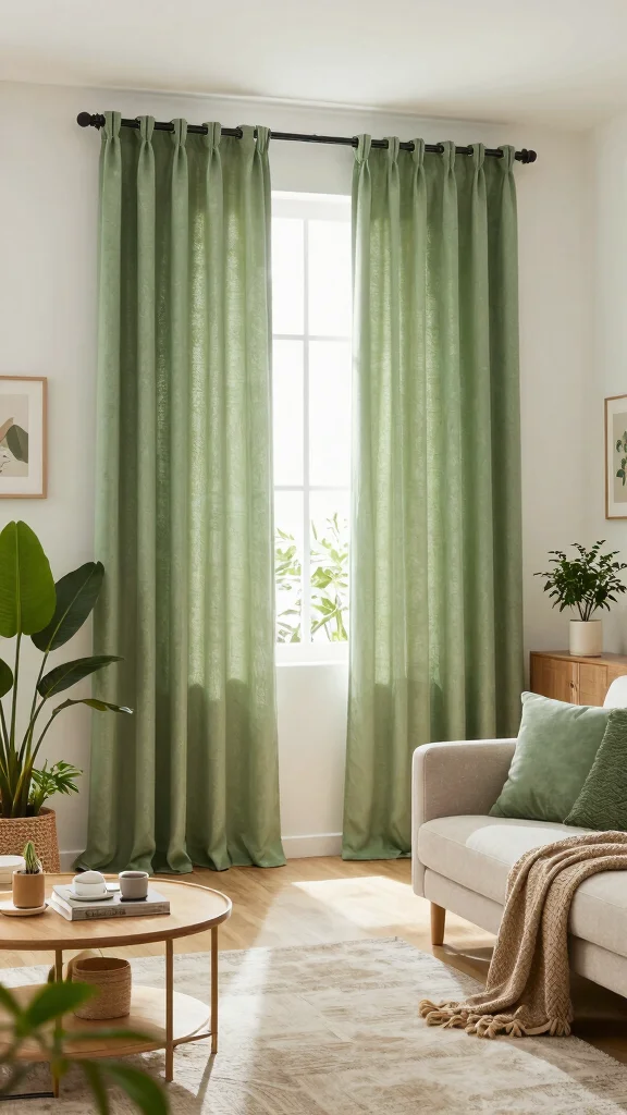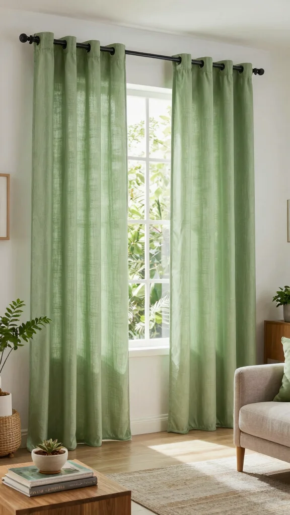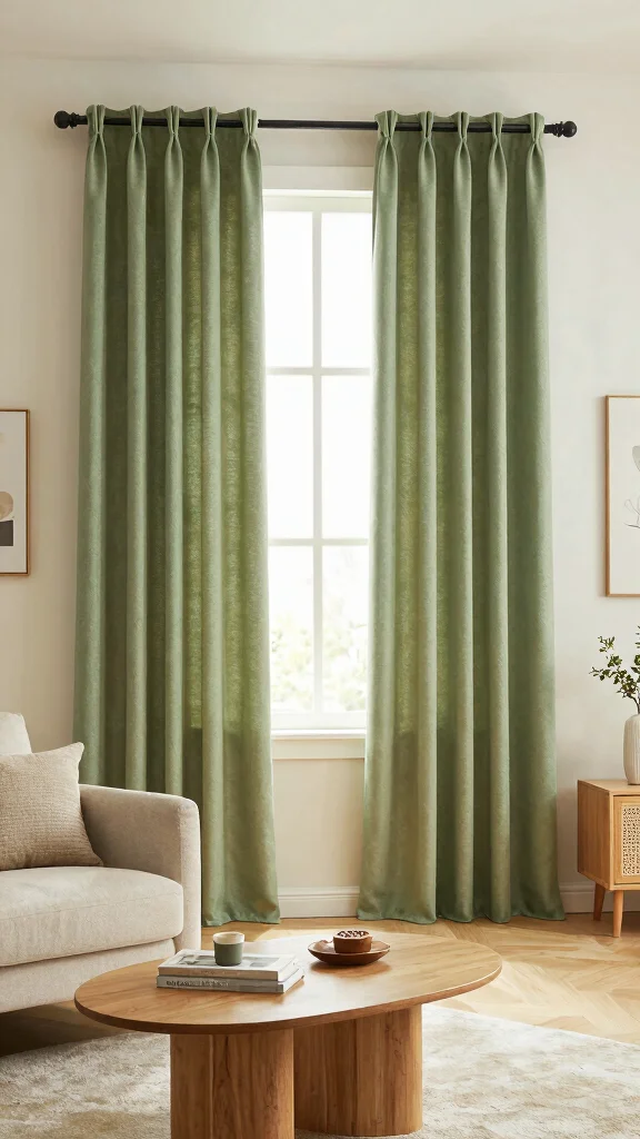 We all want a calm, natural living room, right? Earthy sage curtains soften light, pair beautifully with neutrals, and boost eco-friendly vibes. Start with cotton or linen, then layer textures for a truly green curtains living room vibe.