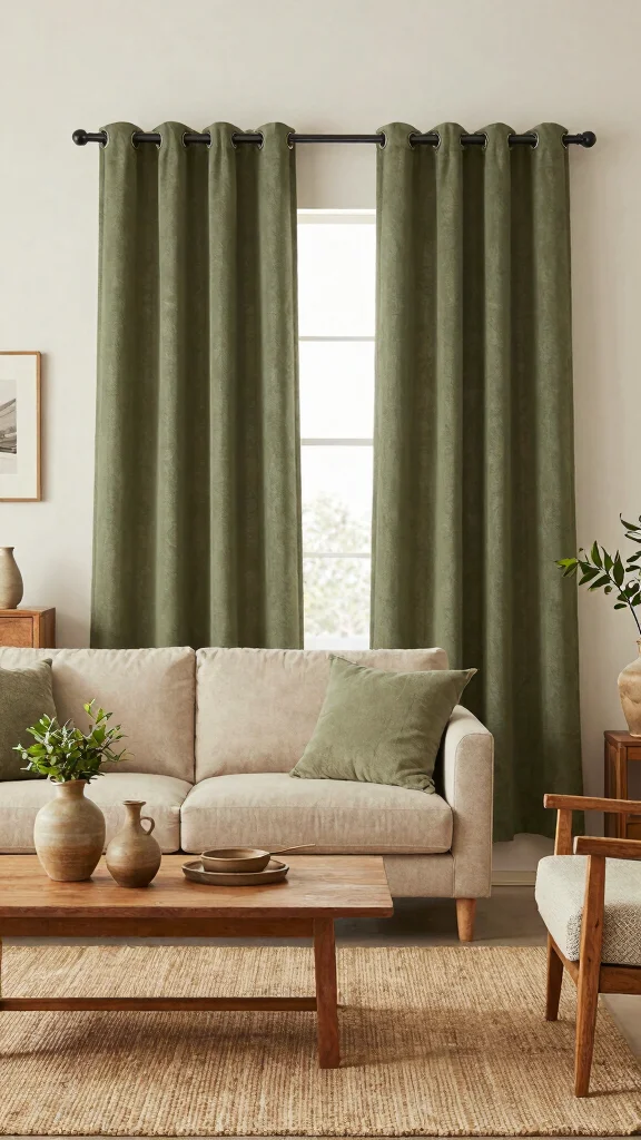 To achieve this look, combine olive curtains with natural textures like burlap or linen for a cohesive design. Pair them with terracotta vases or clay decor to enhance the earthy vibe while staying within budget-friendly options.