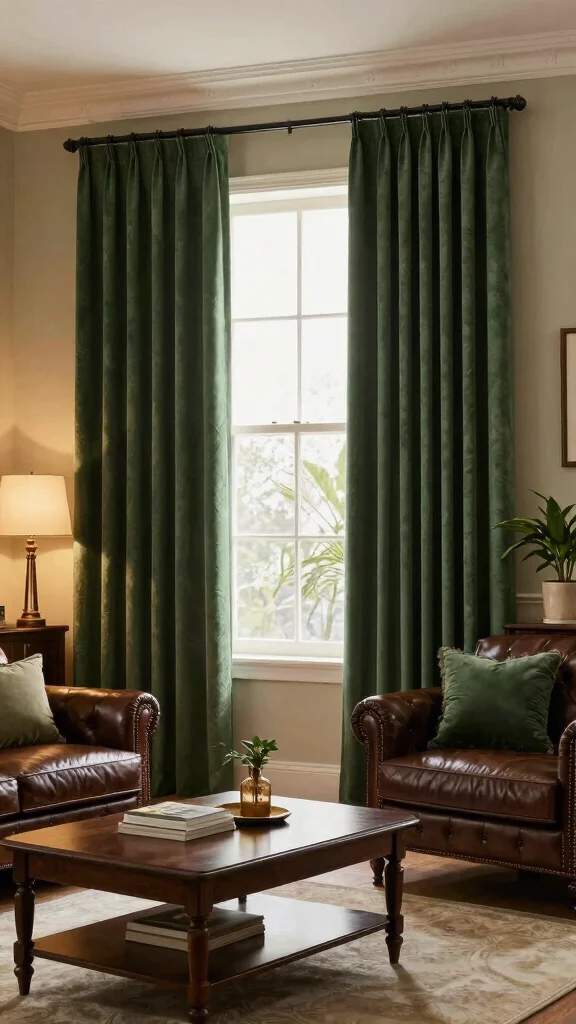 Forest green curtains offer a deep, rich tone that adds sophistication and depth to your living room. This color choice is ideal for creating a dramatic and intimate atmosphere, especially when paired with warm wood tones. Imagine forest green curtains enhancing the cozy feel of a room filled with rich textiles and dark furniture.