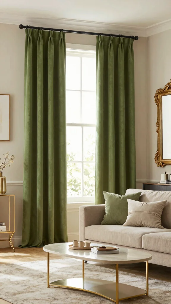 Combining olive green curtains with gold accents can transform your living room decor into a stunning visual experience. The earthy tones of olive paired with the luxe feel of gold create a beautiful balance of nature and elegance. Picture gold-framed mirrors reflecting the warmth of olive curtains, enhancing the overall aesthetic.