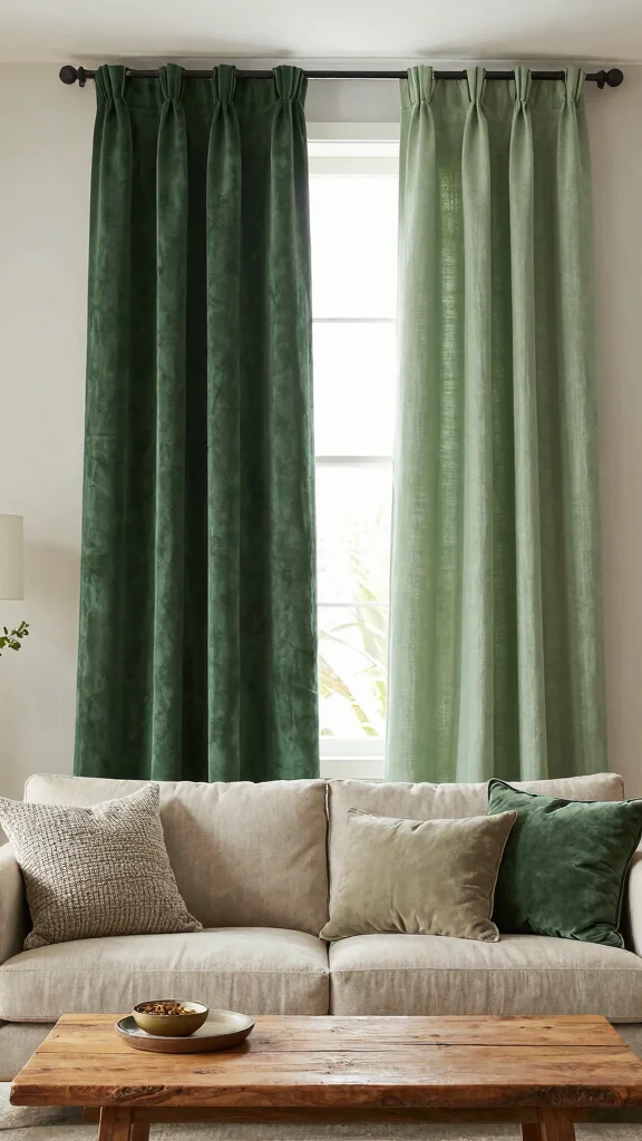 Layering different textures can create a dynamic look in your living room, making it feel inviting and cozy. Consider using green curtains made from a variety of materials like cotton, linen, or velvet to add depth and interest. Imagine a combination of smooth and textured curtains framing a window, inviting warmth and style.