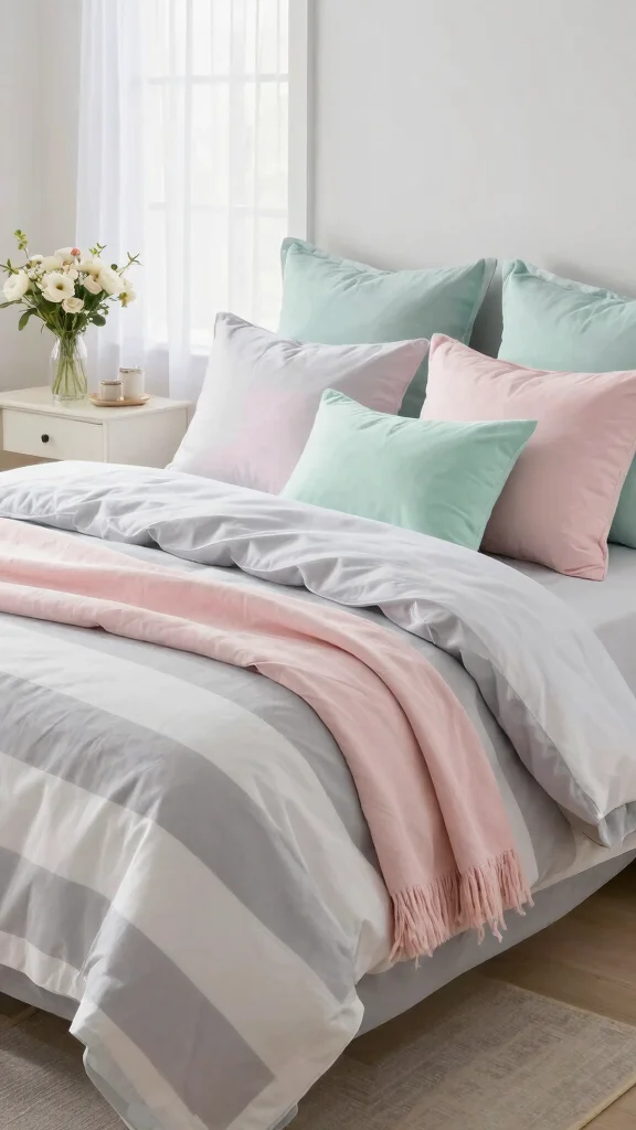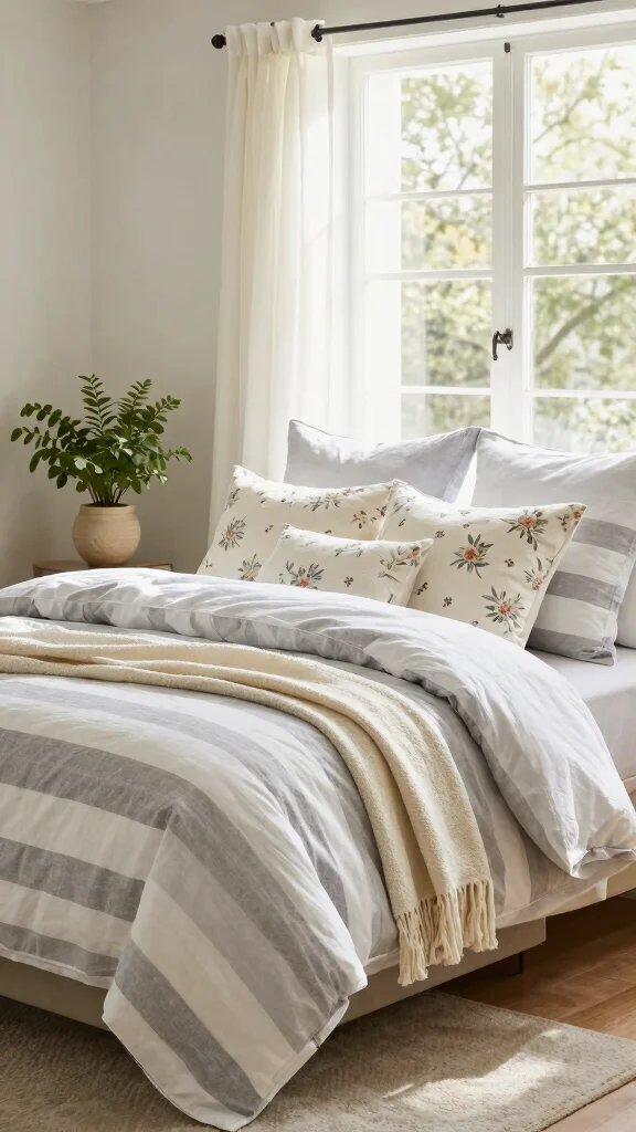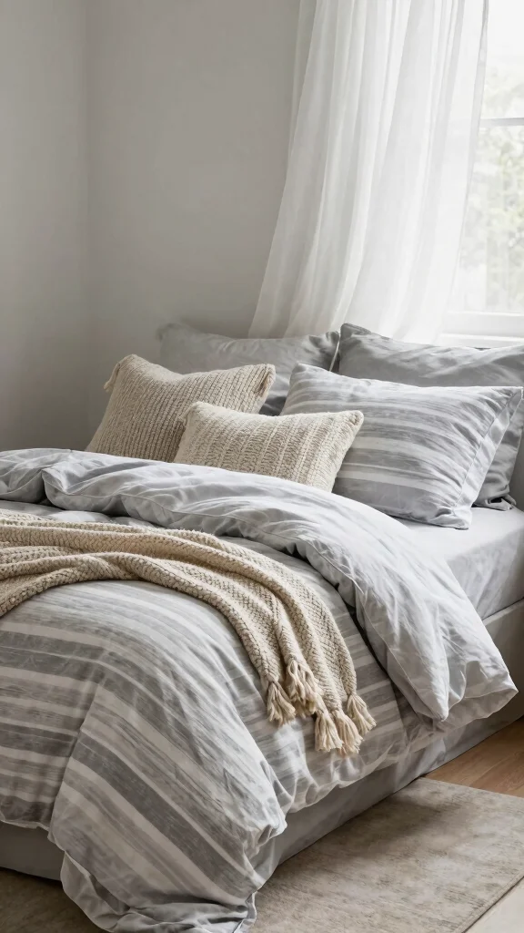 Integrating seasonal colors into your grey and white striped bedding can refresh your bedroom throughout the year. In spring, consider adding pastel accents, while autumn can introduce warm, earthy tones. This practice keeps your space lively and in tune with the changing seasons.