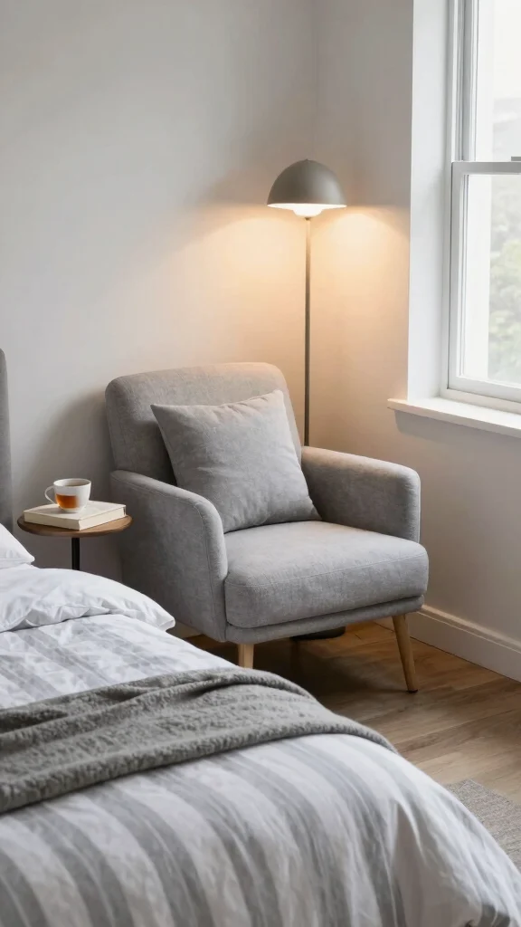 Designing a cozy reading nook in your bedroom can beautifully complement your grey and white striped bedding. Select a comfortable chair or chaise lounge that invites relaxation, ideally situated near a window to capture natural light. A matching throw blanket adds continuity to your overall decor.