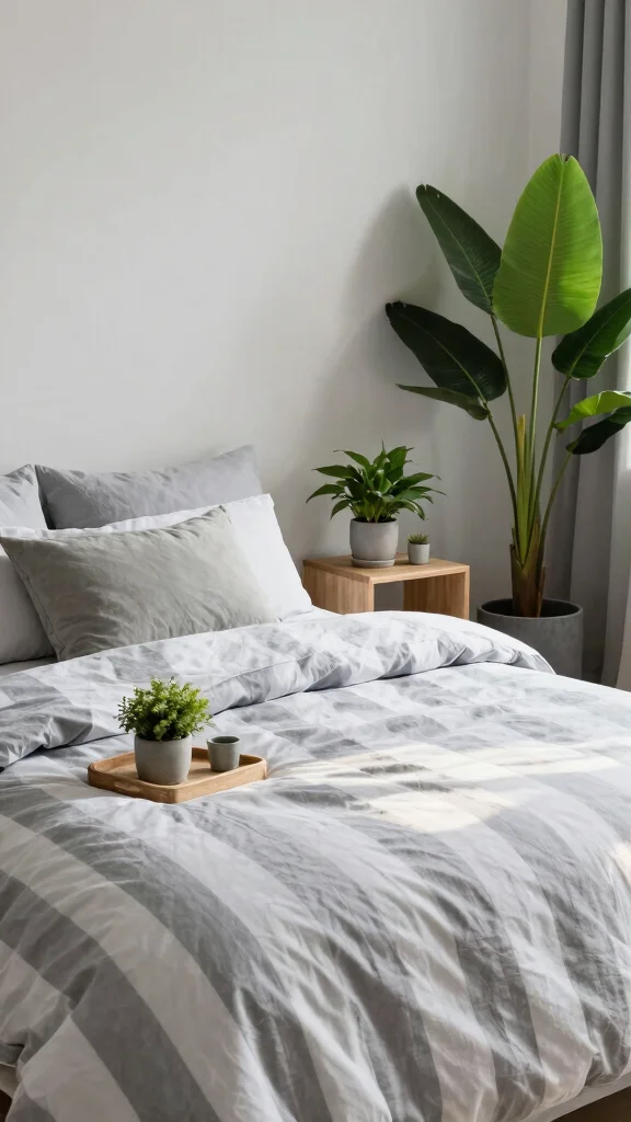 Incorporating natural elements like plants enhances the calming effect of your grey and white striped bedding. Plants not only breathe life into your space but also improve air quality, creating a serene atmosphere. Consider small potted plants on your bedside table or a larger floor plant in a corner to add contrast.