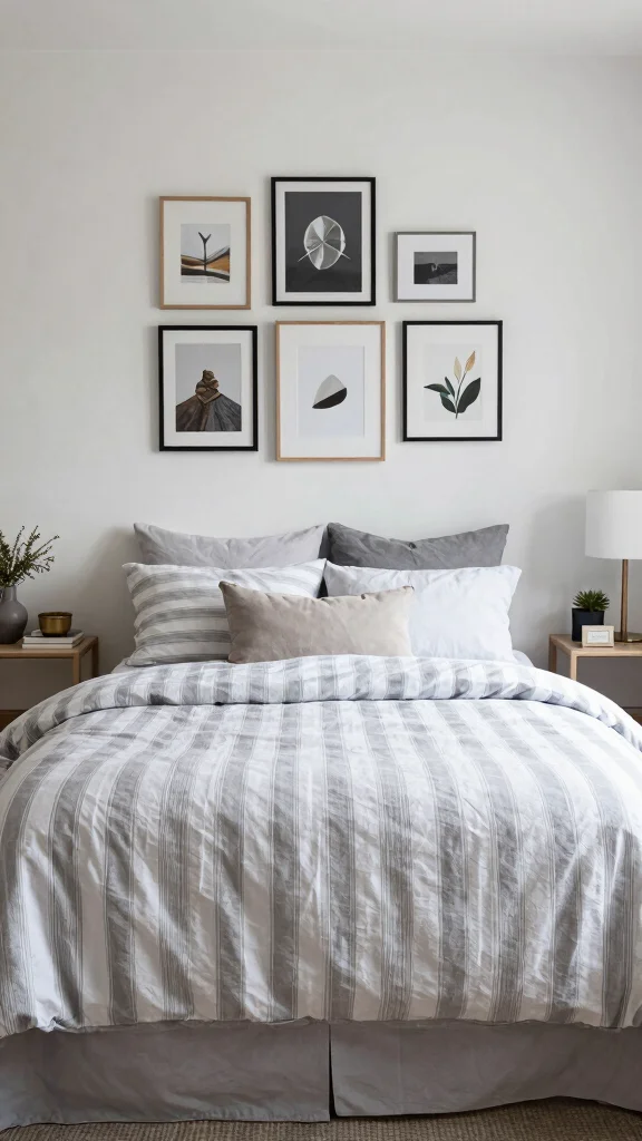 Infusing your personality through art can beautifully complement your grey and white striped bedding. Hang framed photographs, abstract pieces, or even your own creations above the bed or on adjacent walls. This not only elevates your room’s aesthetic but also makes it feel uniquely yours.