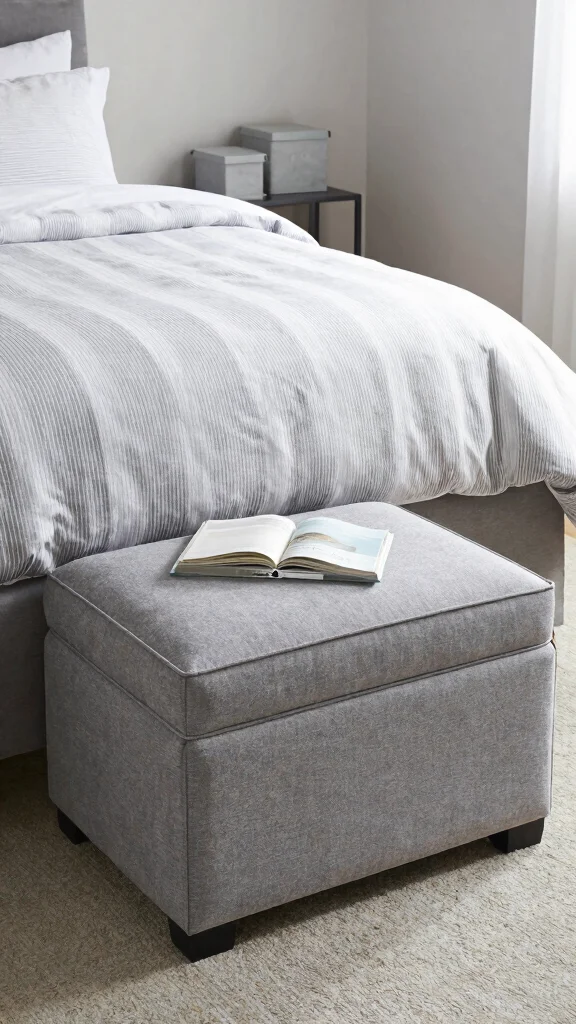 Incorporating functional storage solutions in your bedroom helps maintain a tidy environment without sacrificing style. Consider stylish storage options like a chic ottoman at the foot of the bed that matches your grey and white theme, or fashionable bins under the bed for discreet organization.
