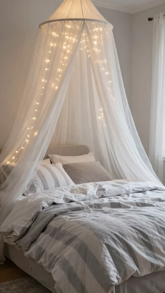 Fun fact: A lightweight canopy over a bed can visually raise ceiling height by up to 20%, especially with sheer fabric over grey and white striped bedding. Tip: choose fabrics in soft neutrals and hang just high enough to keep the space airy.