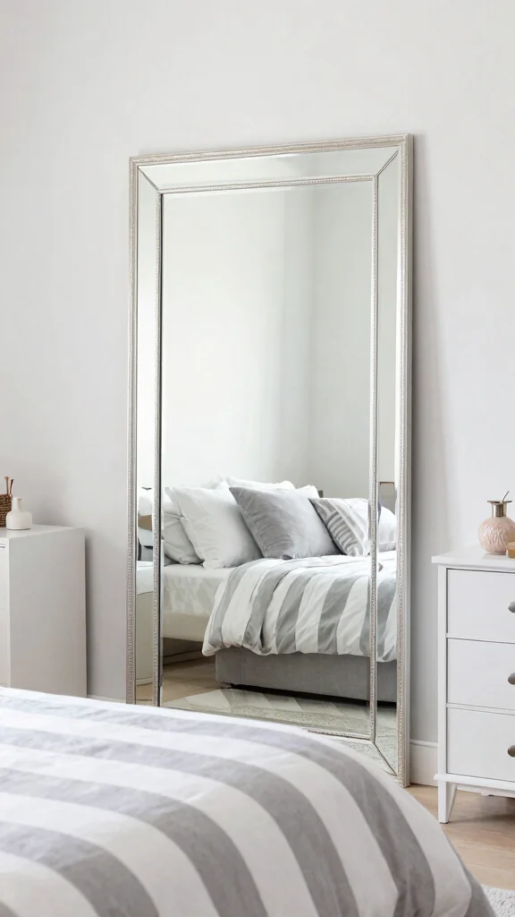 Incorporating mirrors into your bedroom decor can create the illusion of depth, making your space feel larger and complementing your grey and white striped bedding. A large mirror on one wall can reflect light and enhance the airy feel of the room. Decorative mirrors can also serve as statement pieces that tie the entire aesthetic together.