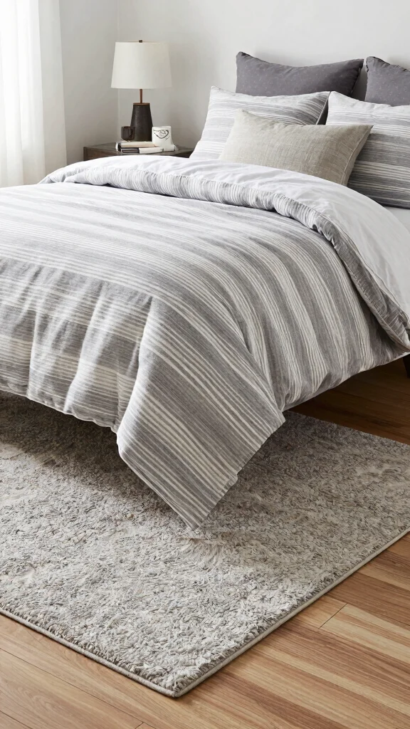 Rugs can define spaces and add warmth to your bedroom. Incorporating a well-placed rug underneath your grey and white striped bedding can ground the room and create a cohesive look. Opt for a soft, plush area rug that contrasts beautifully with your flooring, providing a cozy underfoot experience.