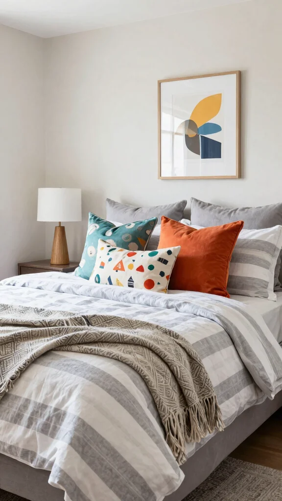 Integrating playful patterns through accessories can infuse personality into your grey and white striped bedding. Consider adding accent pillows with floral or geometric prints that contrast beautifully with your bedding, energizing the space while keeping it from feeling overpowering.