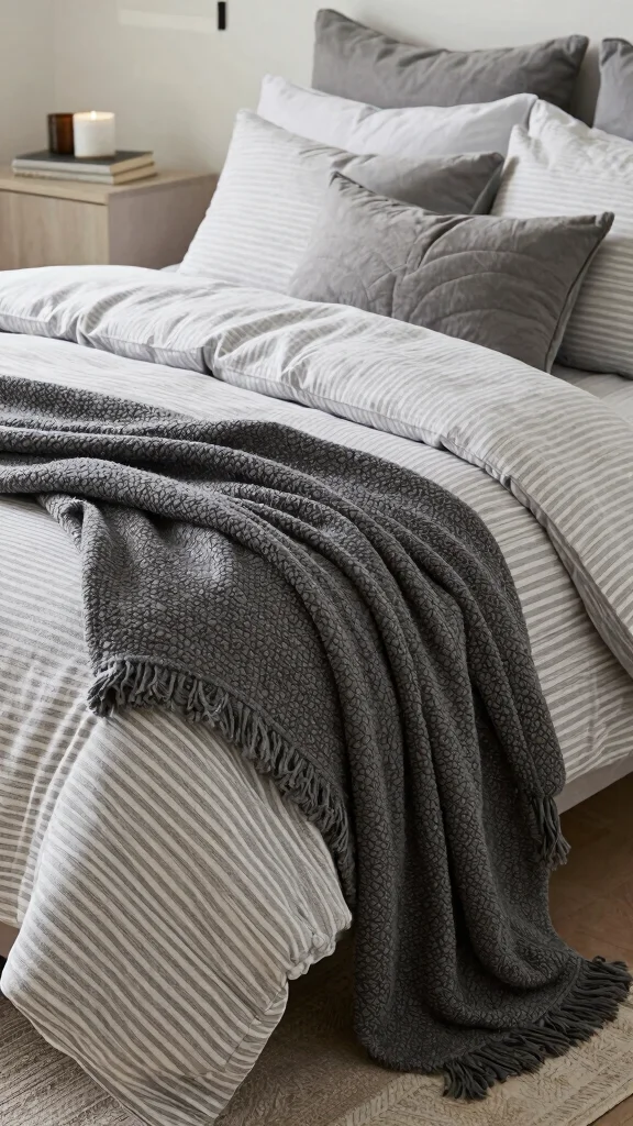 – Layering Techniques: Learn about layering solid gray sheets with striped bedding to enhance texture and depth in your bedroom decor.