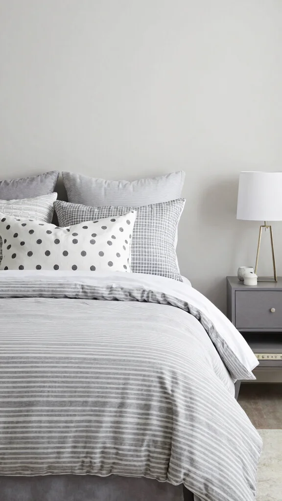 Combining grey and white stripes with other monochromatic patterns can create a chic and layered effect in your bedroom. Think about incorporating simple patterns like polka dots, checks, or houndstooth in black and white alongside your striped bedding. This playful blend evokes sophistication without feeling cluttered.