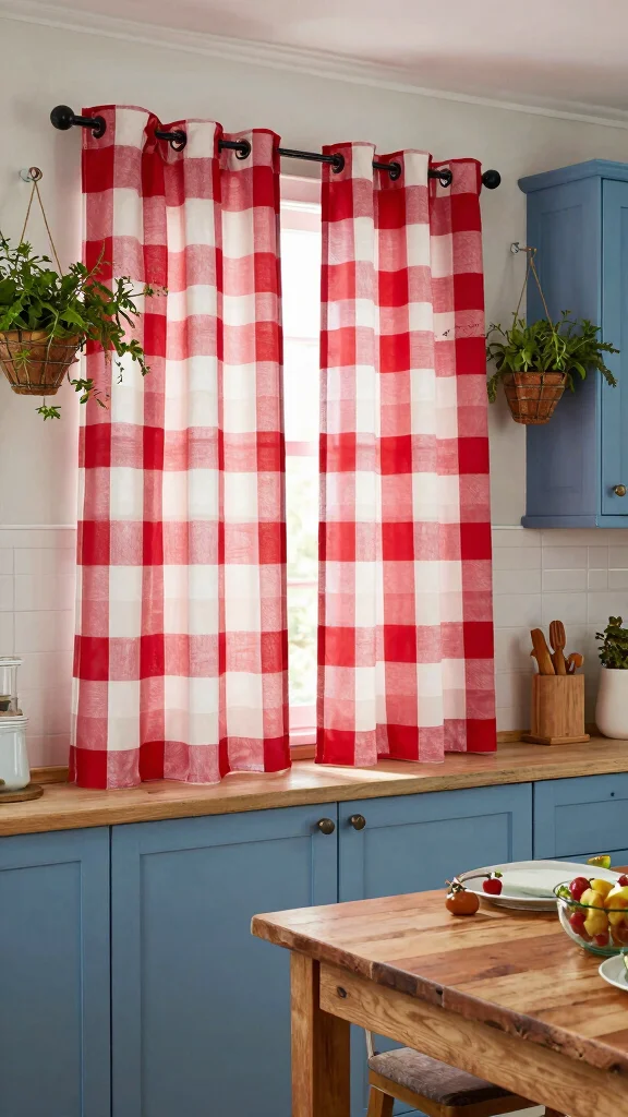 Colorful checks and plaids give your kitchen instant cottage-charm. Mix a few patterns and pops of red, blue, or green, and you’ll create a playful, timeless look with half window curtains kitchen flair.