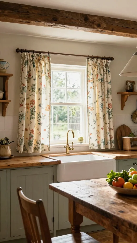 To style them on a budget, start with a vintage floral pattern that harmonizes with your wood tones. Pair the fabric with warm neutrals and natural textures like exposed beams to emphasize rustic kitchen design. Choose a lightweight cotton or linen blend and keep the rod simple. For half curtain ideas, layer a sheer under the floral panel or use a coordinating solid that frames the window.