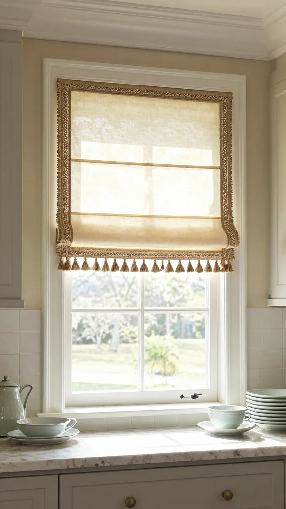 Combining the elegance of Roman shades with decorative trim creates a tailored look that feels both classic and modern. This design adds a unique touch to your kitchen bay window while maintaining a polished appearance. You can choose from various trims, such as pom-poms or tassels, to enhance the shades and make them stand out.