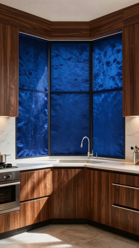 Luxurious velvet drapes add an elegant touch to your kitchen bay window, enriching the space with depth and sophistication. The rich texture of velvet, especially in bold colors like deep emerald or royal blue, pairs beautifully with metallic accents, creating a warm and inviting atmosphere. These drapes not only elevate your decor but also provide insulation, keeping your kitchen cozy year-round.
