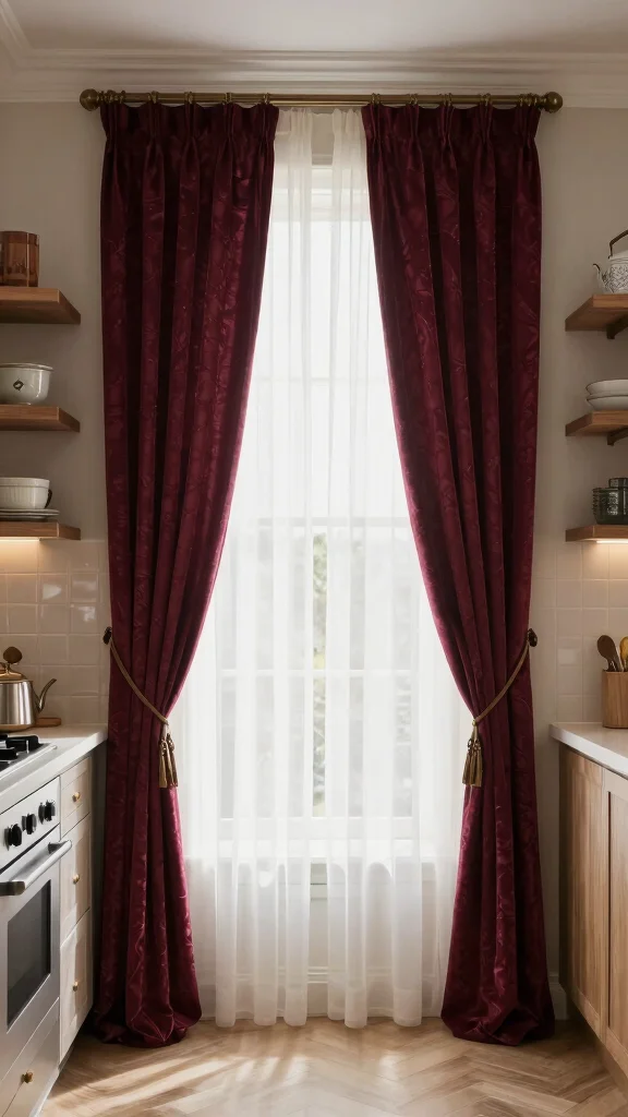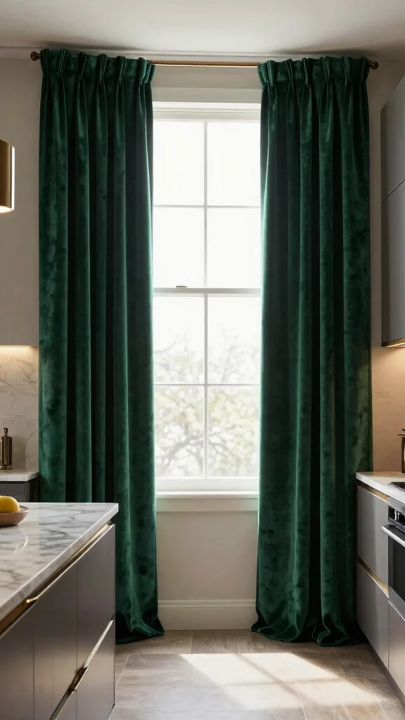 For a dramatic effect, opt for floor-length velvet drapes, accented with a decorative rod to enhance their allure. Keep in mind that while velvet adds glamour, it does require regular cleaning to maintain its plush appearance. This style works wonderfully in modern kitchens, providing a striking contrast and enhancing the overall decor.