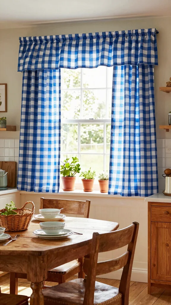 – Use cafe-style gingham curtains for a casual, laid-back vibe