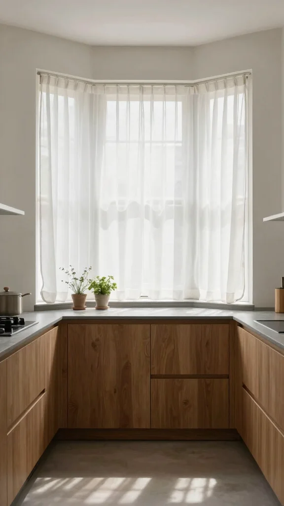 Sheer curtains offer a minimalist approach that’s perfect for your kitchen bay window. Their lightweight fabric allows ample light to flood the space, creating a bright and airy feel. These curtains can also be layered with heavier drapes for added versatility, giving you control over privacy and light levels.