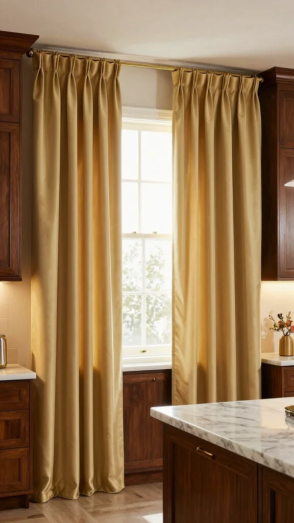 Select soft shades or jewel tones that reflect light and enhance your kitchen’s warmth. Use a decorative rod to showcase the beauty of your silk panels while considering care options for easy maintenance.