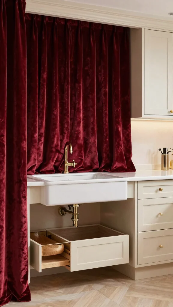 For a touch of luxury, consider using elegant velvet drapes below your sink. The rich texture and deep colors can elevate the sophistication of any kitchen. Velvet not only looks stunning but also provides insulation, making it a practical choice for energy efficiency. Opt for jewel tones like emerald green or sapphire blue to create an opulent look while discreetly covering your under-sink area.