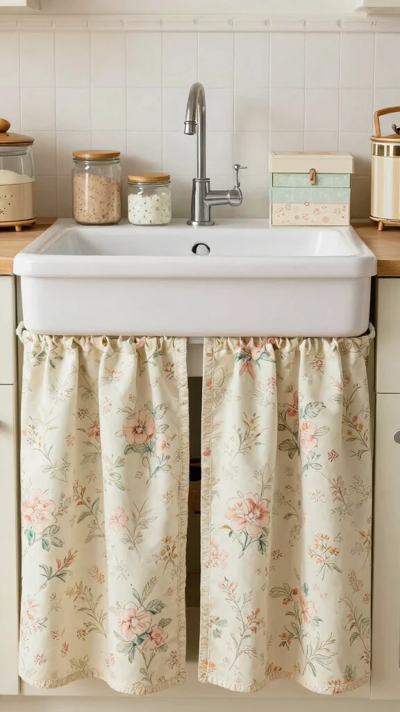 To enhance the storage solutions, consider using matching vintage-style jars or boxes to store cleaning supplies below the sink. This creates a cohesive look while adding character to your kitchen. Vintage floral prints can infuse your space with personality, making it feel more like home.