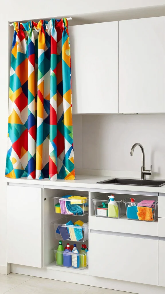 To enhance your storage solutions, consider using brightly colored containers that either match or contrast with your curtains. This creates a cohesive look while keeping cleaning supplies organized. Embracing whimsy in your kitchen design can inspire creativity and make daily tasks feel more enjoyable.