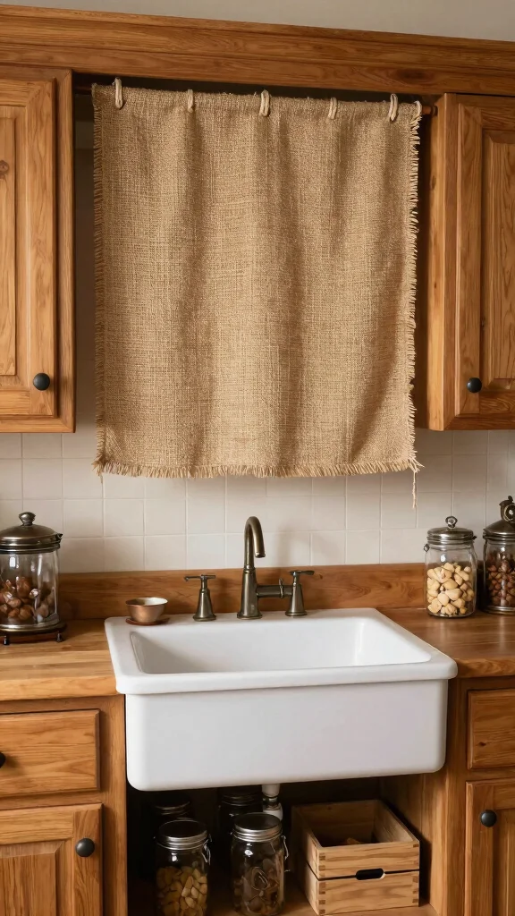 Burlap curtains not only effectively conceal under-sink chaos but also contribute to a warm and inviting kitchen environment.