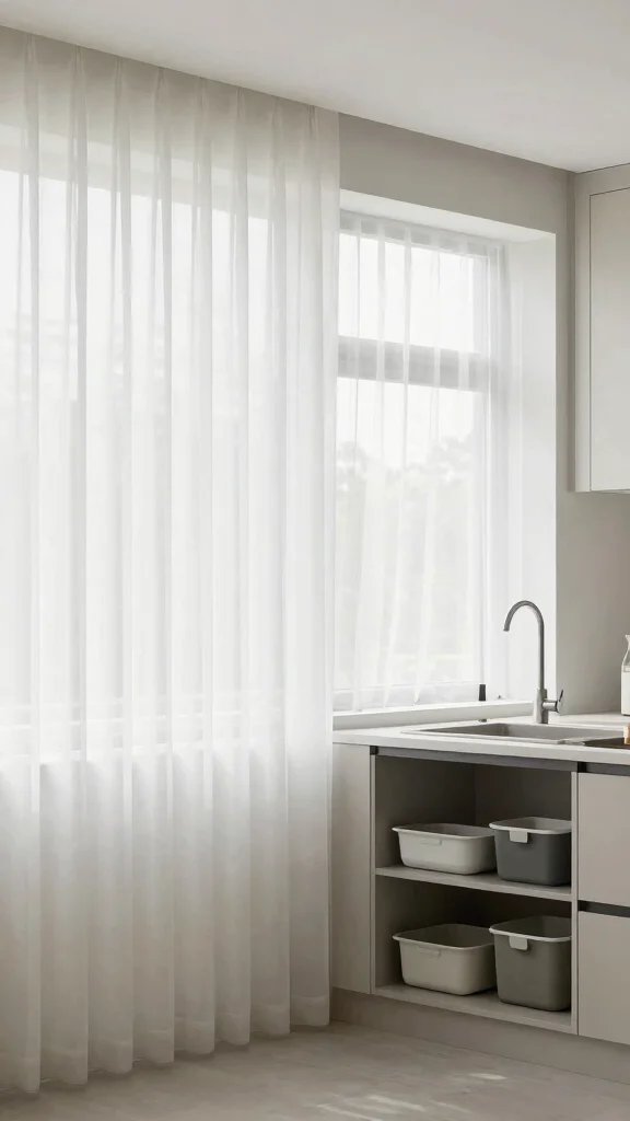 To keep your cleaning supplies tidy and out of sight, consider using matching storage boxes. This simple addition enhances the uncluttered look while maximizing your kitchen’s functionality. Minimalist sheer curtains perfectly balance style and practicality, making them a must-have for modern spaces.