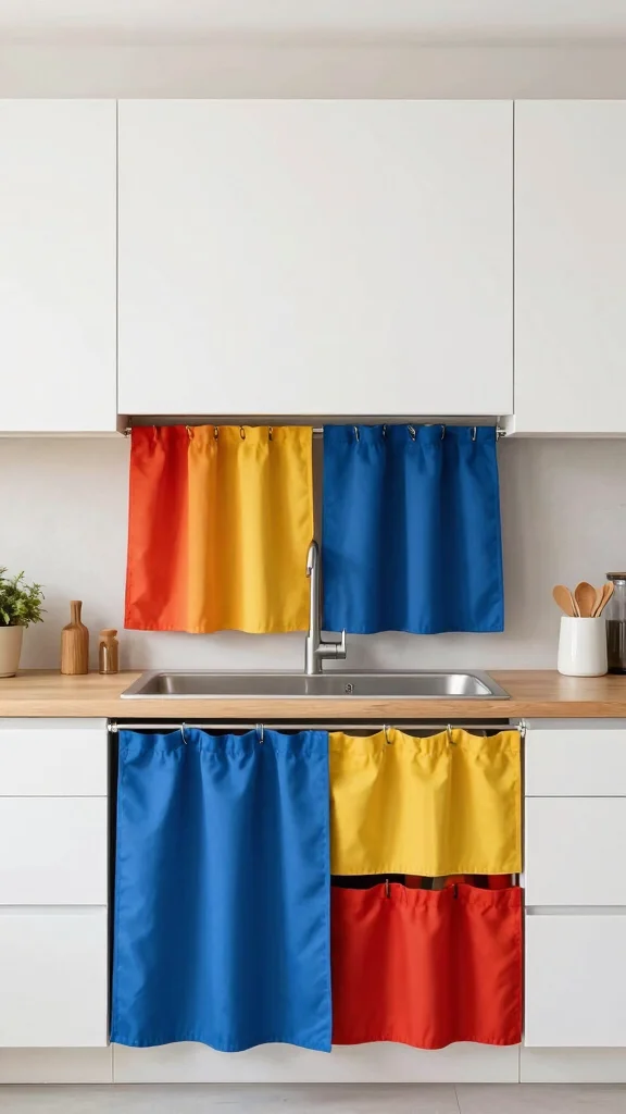 Add a lively splash of color to your kitchen with vibrant color block curtains. These bold designs can infuse energy into your space while effectively concealing under-sink essentials. Choose contrasting colors to create a statement or opt for a gradient effect for a more subtle appearance. Color block curtains can serve as a focal point, enhancing your kitchen’s overall aesthetic.