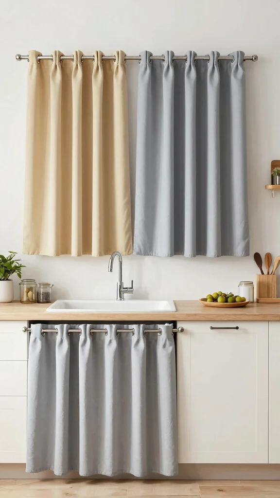 Create a rich, textured look in your kitchen by layering curtain styles. Combining sheer curtains with heavier fabrics offers depth while effectively hiding under-sink clutter. This approach not only adds visual interest but also allows for versatility in light control. Opt for complementary colors to ensure a harmonious blend that enhances your kitchen’s design.