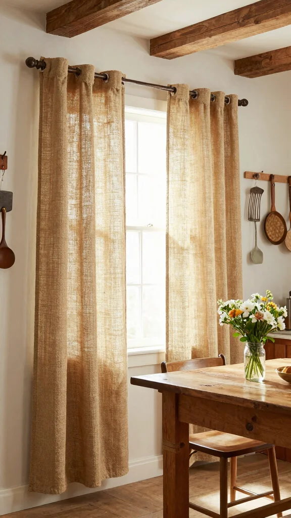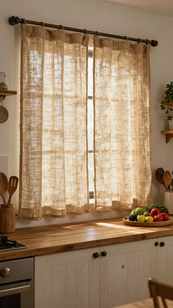 For a softer look, consider layering burlap with sheer curtains. Using burlap in its natural color enhances its rustic appeal while allowing you to incorporate other textures in your kitchen.