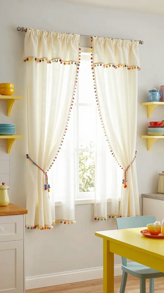 Pom-pom cafe curtains add vibrant energy to your kitchen, making every meal feel like a joyous occasion.