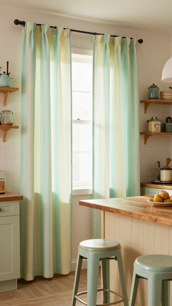 Stripes are a classic choice that adds an element of nostalgia to your kitchen. Vintage-inspired striped cafe curtains offer a timeless look while adding a trendy touch. Opt for muted pastel colors to keep the overall vibe soft and inviting, making your kitchen feel welcoming.