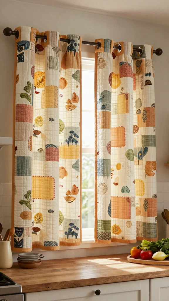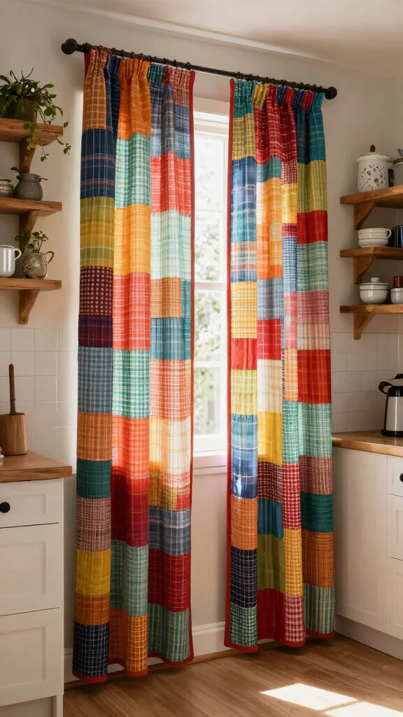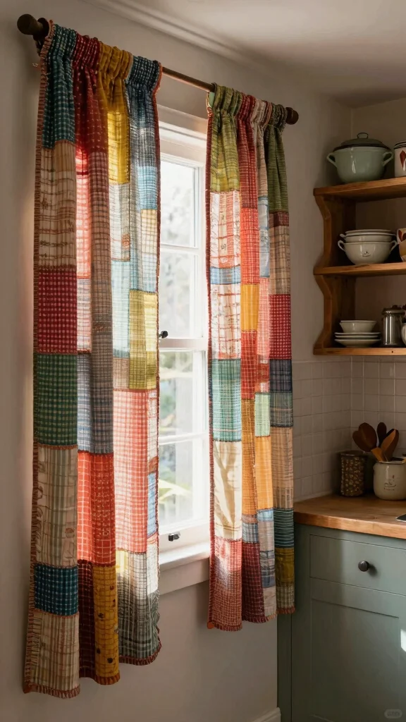 Colorful patchwork curtains bring playful eclecticism to your kitchen, with each fabric piece telling a unique story. This style allows for creative mixing and matching, perfect for those who love to express their individuality. Patchwork works beautifully in farmhouse settings, highlighting the charm of rustic decor. You can opt for handmade patchwork curtains or create your own for a personal touch.
