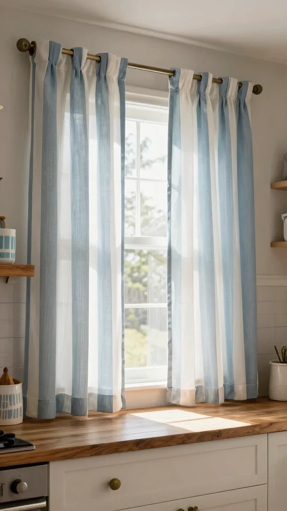 Nautical-inspired curtains create a serene atmosphere, making your kitchen a perfect retreat for relaxation.