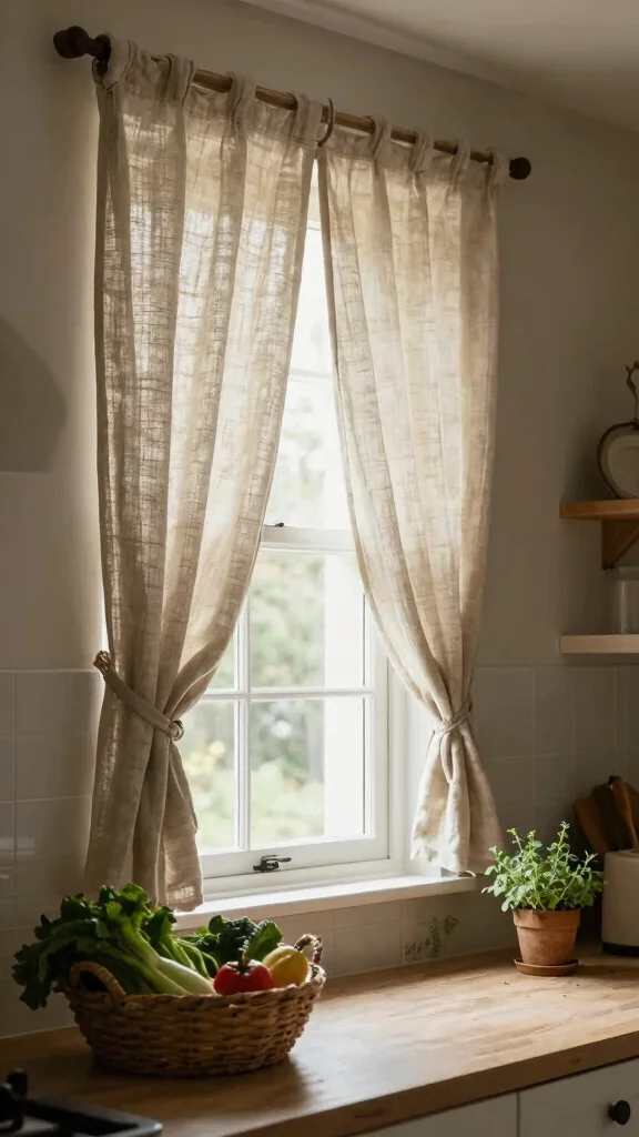 Natural linen drapes bring a minimalist yet inviting touch, lending a sense of tranquility to your kitchen space.
