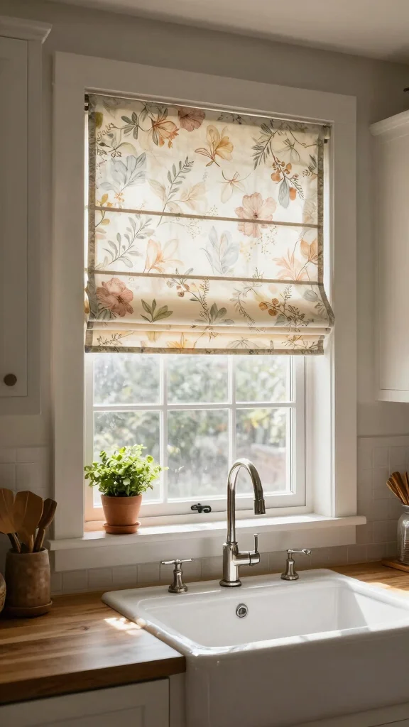 Patterned roman shades offer a polished yet cozy window treatment option for your kitchen. They are practical for managing light and privacy while introducing cheerful designs that can align with your decor theme. Opt for floral or botanical prints that resonate with the natural elements of your kitchen. Roman shades are perfect for smaller windows, as they maintain a clean look while taking up minimal visual space. You can hang them within the window frame or above the trim for a tailored appearance that enhances your kitchen’s aesthetic.