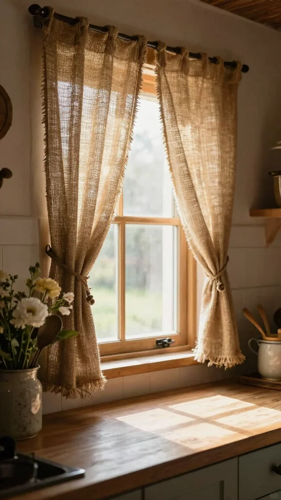 Burlap curtains bring a rustic vibe to your kitchen while being durable and practical. The unique texture of burlap adds warmth and a cozy feel, creating an inviting space. You can use burlap alone or layer it with sheer fabrics for a softer look, depending on your style. Its neutral tones blend seamlessly with a variety of color schemes, making it versatile for farmhouse decor. To enhance the rustic charm, pair burlap curtains with wooden rods and consider using tie-backs for a more elegant presentation.