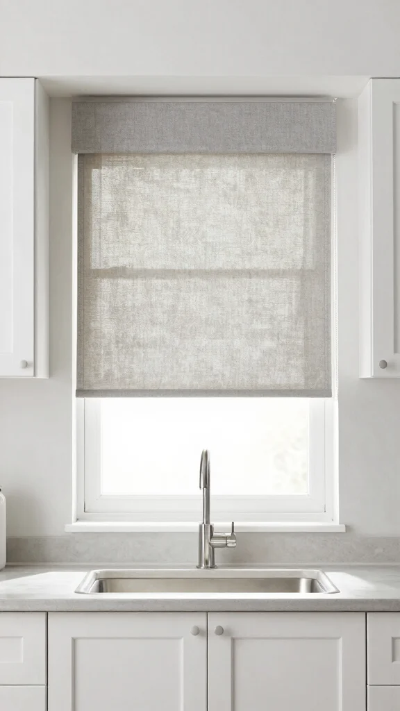 Neutral textured roller shades represent a fantastic minimalist option for your kitchen window. These shades blend seamlessly with your decor while offering clean lines and functional light control. Their modern design minimizes visual obstruction, which is especially beneficial in smaller spaces. Look for shades with subtle textures to add depth without overwhelming your decor.