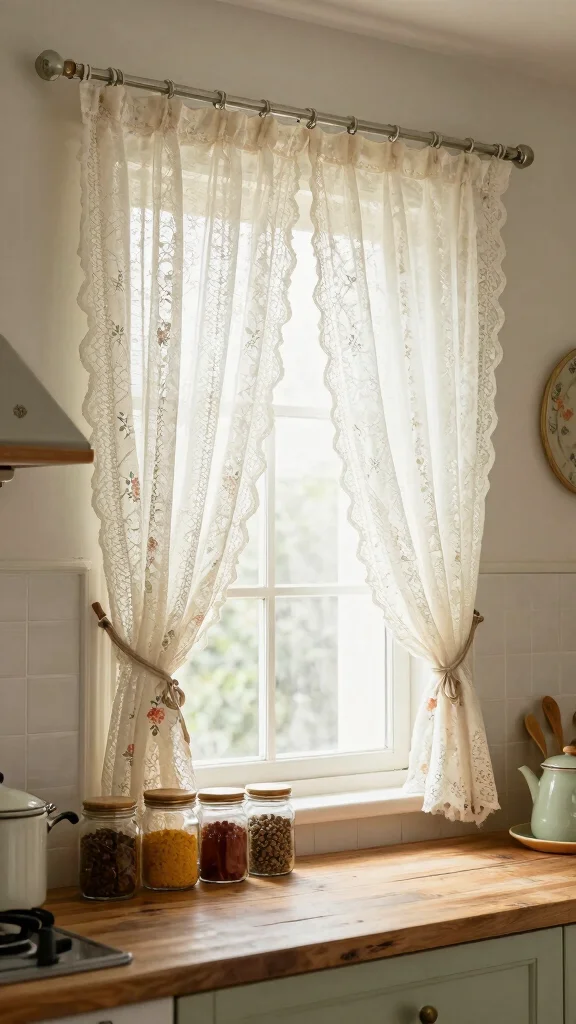 Their intricate patterns add a delicate touch, creating a warm and inviting ambiance. Pair them with muted pastel shades or rustic wooden accents to amplify their vintage charm. This look suits both cottage-style kitchens and modern spaces that embrace a nostalgic flair. A simple curtain rod positioned just above the window frame allows natural light to pour in while still offering a hint of privacy.