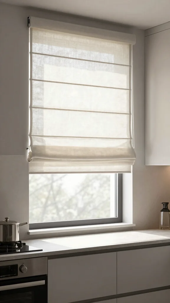 Roman shades offer a stylish and functional option for compact kitchen windows.