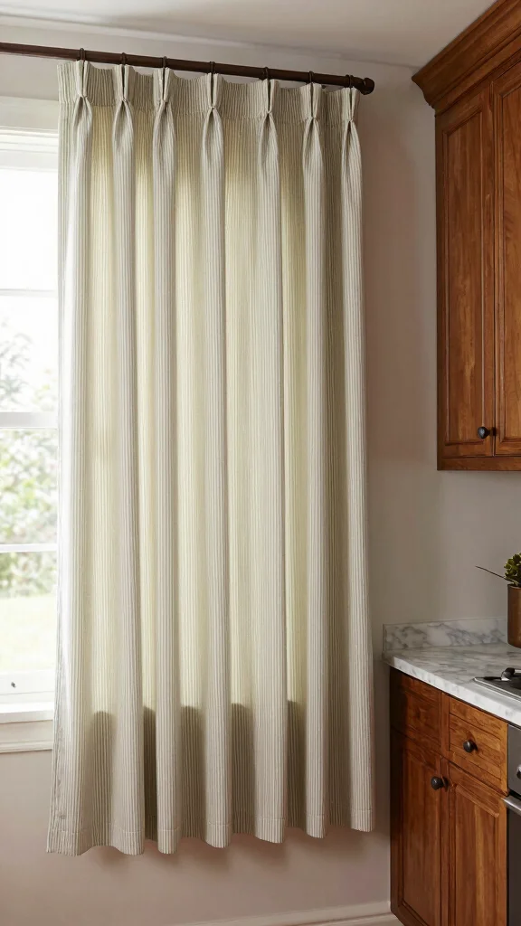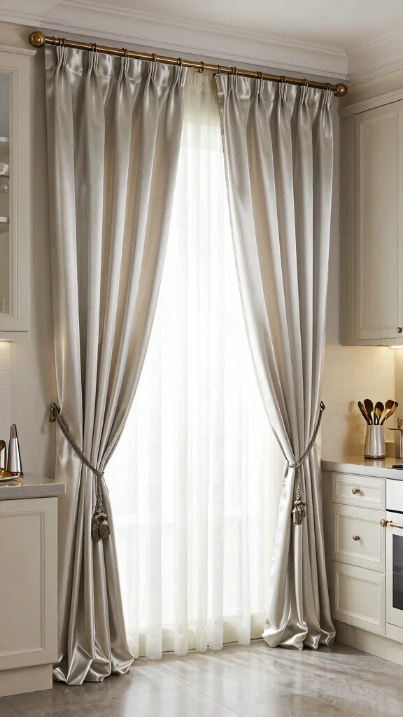 Choose luxurious fabrics like silk or satin to elevate the overall design. Tiebacks allow you to pull the curtains aside, letting in light while showcasing the fabric’s beauty. This style is perfect for kitchens that aim to make a chic statement. Pair with complementary decor, such as a stunning chandelier or stylish dishware, for a unified aesthetic.