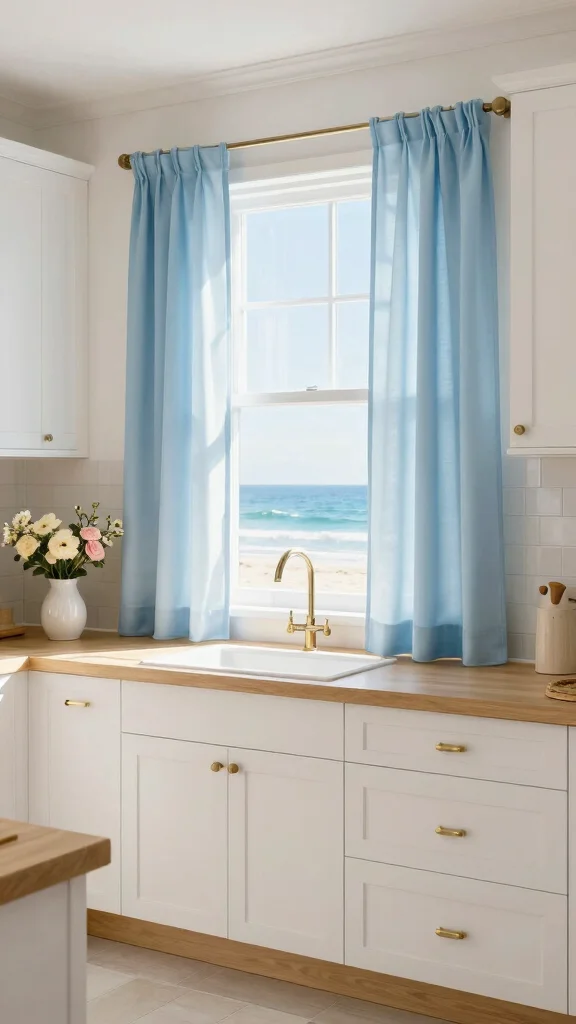 Introduce the refreshing essence of the coast to your kitchen with light, airy curtains. Fabrics in soft blues and whites mimic the sea breeze, creating a serene atmosphere that invites relaxation. These curtains add a breezy feel, perfect for brightening up your cooking space.