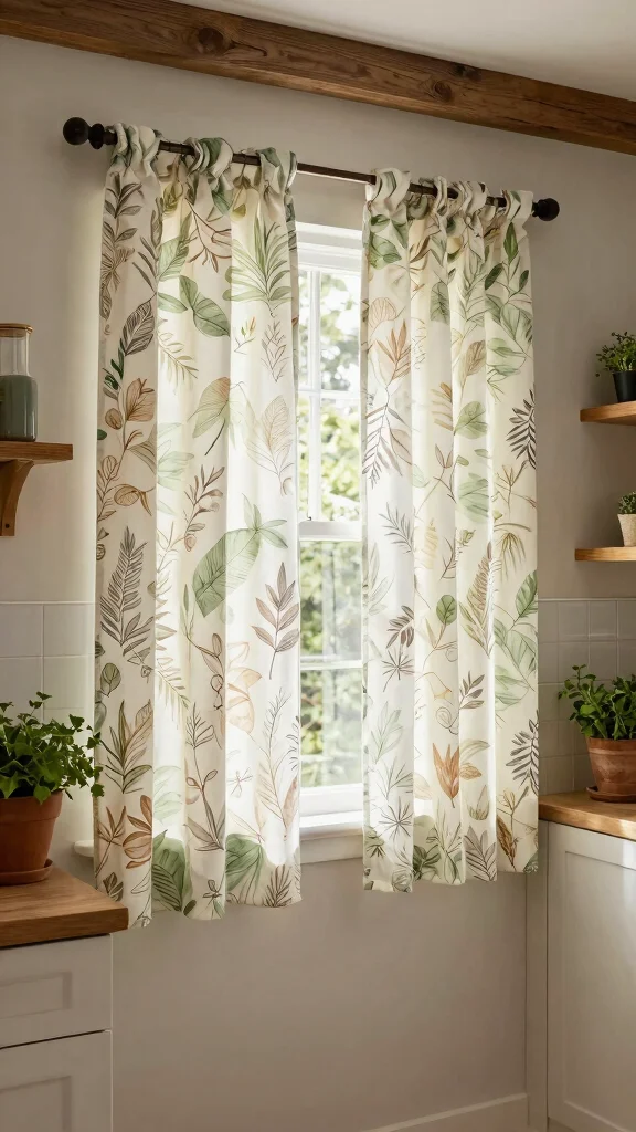 For nature enthusiasts, curtains crafted from nature-inspired fabrics can beautifully bring the outdoors inside. Featuring prints of leaves, flowers, or serene landscapes, these designs cultivate a calming atmosphere in your kitchen. Nature-inspired fabrics create a cozy, organic feel that complements earthy tones and natural materials.