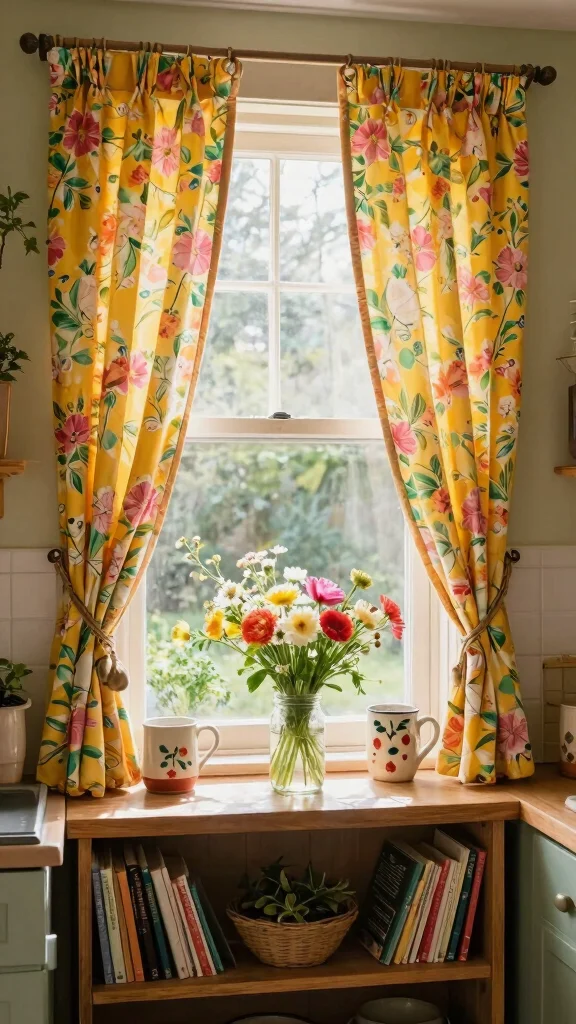 – Pair floral curtains with vintage kitchenware for cohesion