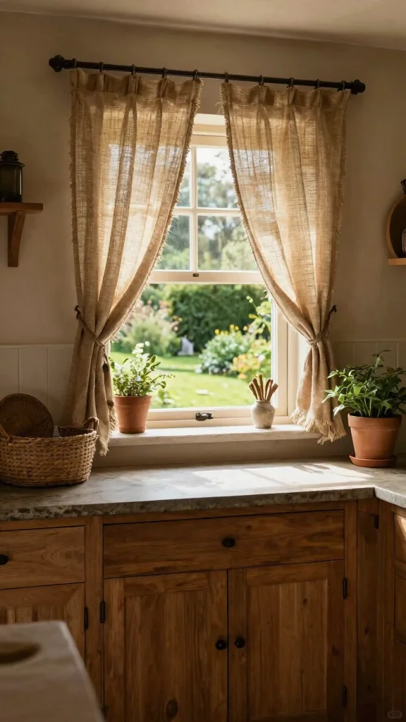Jute curtains will instill a warm, cozy ambiance in your kitchen, perfect for those serene mornings spent sipping coffee.