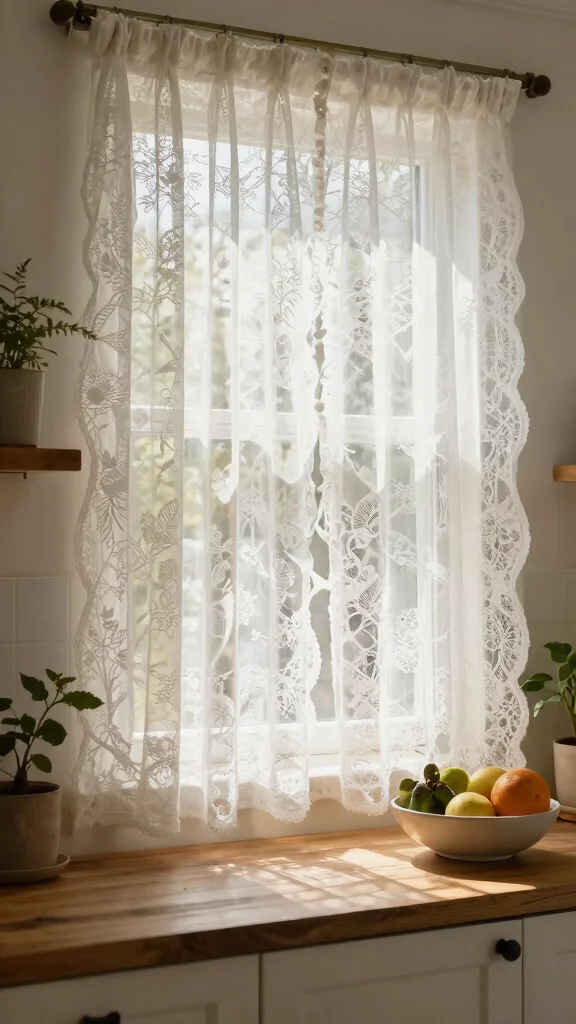 Layering lace with heavier drapes can create depth and sophistication. These accents evoke a cozy elegance that enhances the overall character of your kitchen, making it a delightful space to gather.